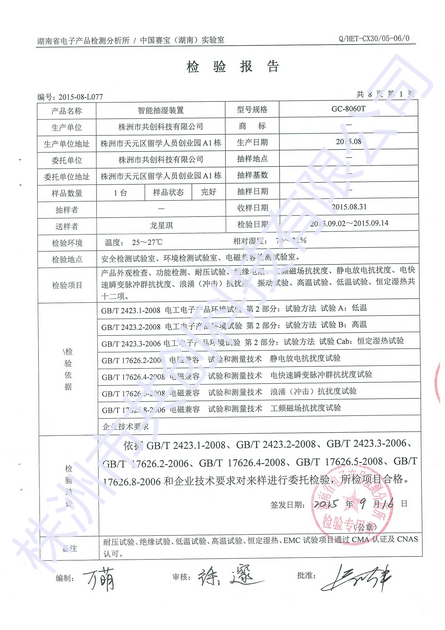 我公司針對(duì)GC-8060的除濕效果做了相關(guān)實(shí)驗(yàn),把GC-8060放在一個(gè)1.5立方米的密封箱體內(nèi),開啟手動(dòng)除濕功能,3個(gè)小時(shí)候后,濕度由原來的75.6%RH降到了51.2%RH左右;溫度由原來的25.1度上升到32.7度。實(shí)驗(yàn)結(jié)果,濕度下降了24.4%RH,溫度只上升了7.6度,;實(shí)驗(yàn)結(jié)果表明:使用GC-8060可全部解決箱體內(nèi)的驅(qū)潮問題,而且很大除濕功率只有60W。